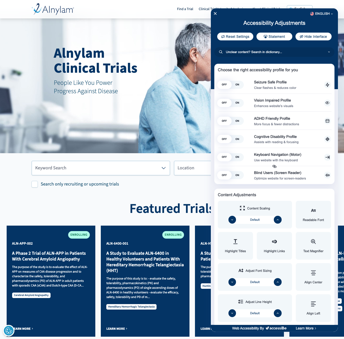We carefully designed Alnylam’s Clinical Trials website to provide patients, healthcare providers, caregivers, and the public with a user-friendly, and mobile-optimized environment to explore our trials, find trial locations, and understand the recruiting status of each trial.